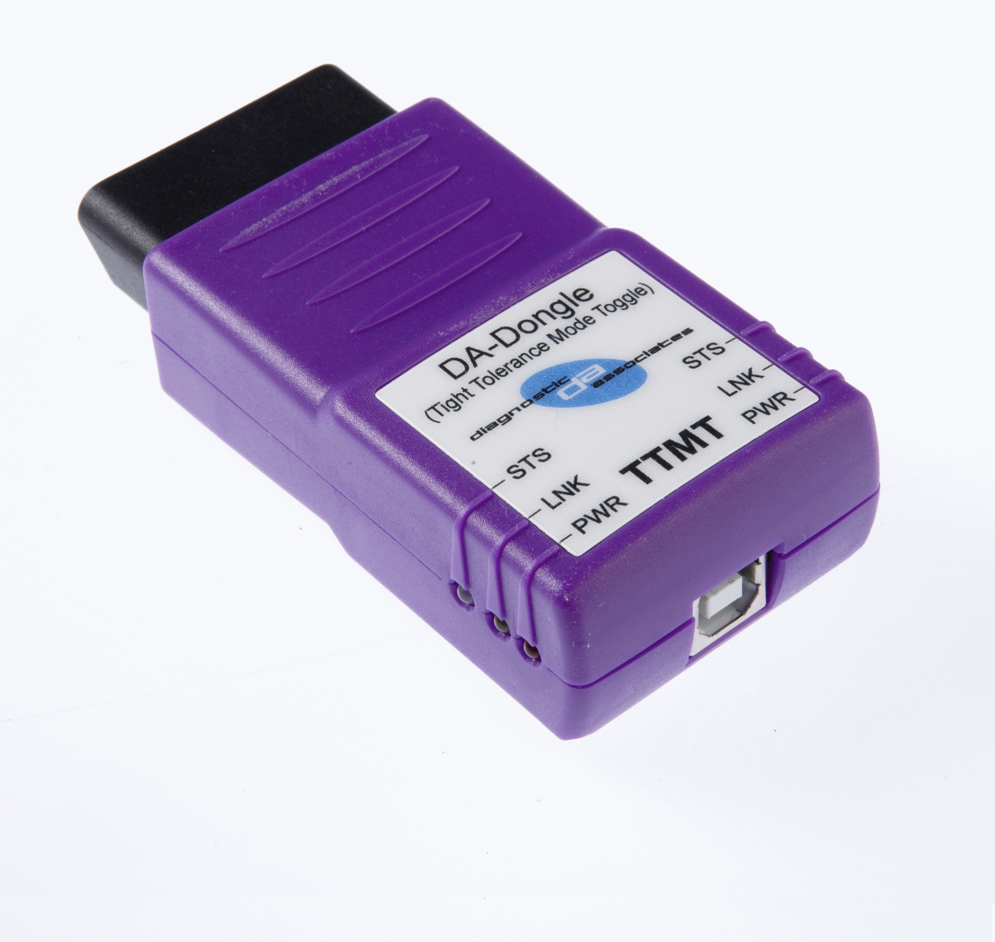The DA-Dongle TTMT connects directly to the vehicle OBDII (Diagnostic) connector, and it is a stand-alone product. Once connected to the vehicle it will toggle between Tight Tolerance Mode and Customer Mode on the vehicle via diagnostic communication. This will then allow wheel alignment etc. to be performed on the Jaguar Land Rover range.